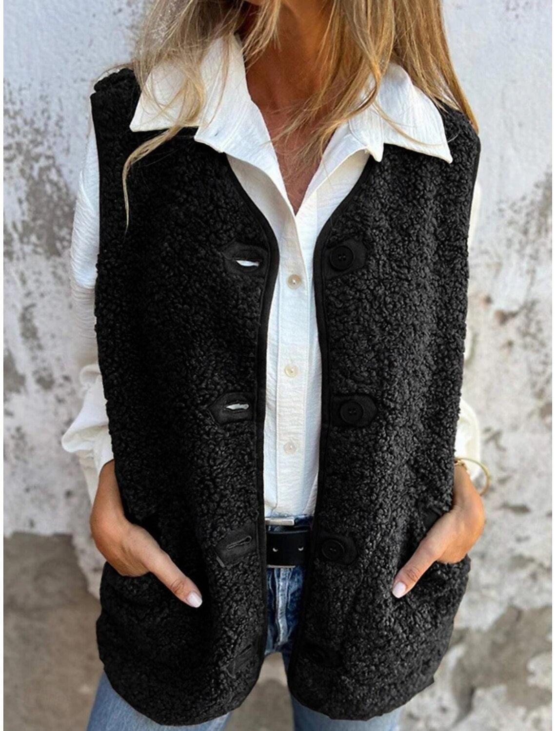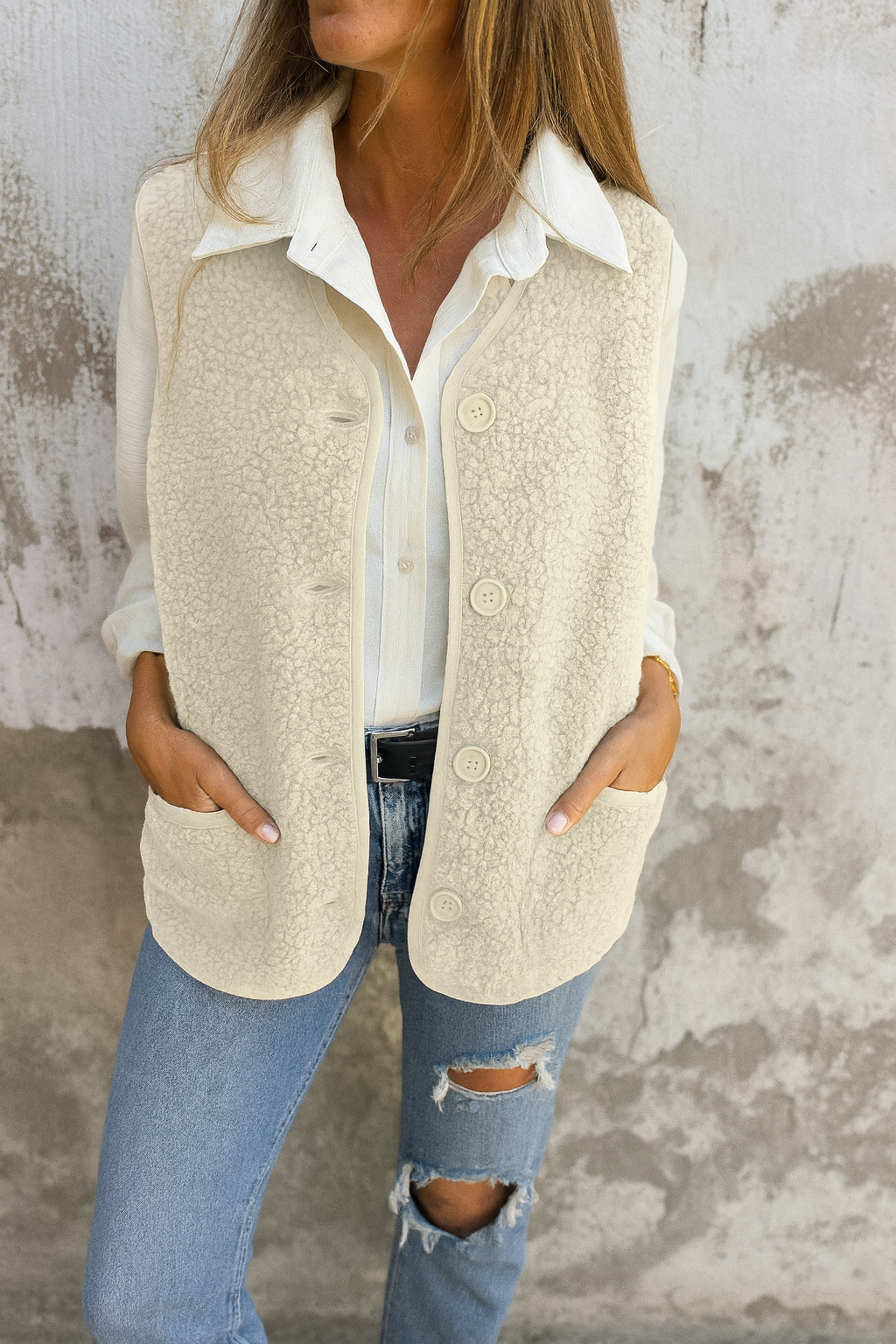 El chaleco Eva es la prenda perfecta para mantenerte abrigada sin renunciar al estilo. Su diseño con forro polar suave y textura tipo borrego ofrece una sensación cálida y acogedora, ideal para combinar con camisas, jerséis o camisetas básicas. Los botones frontales y los bolsillos laterales aportan un toque práctico y casual, convirtiéndolo en un imprescindible del entretiempo y el invierno.