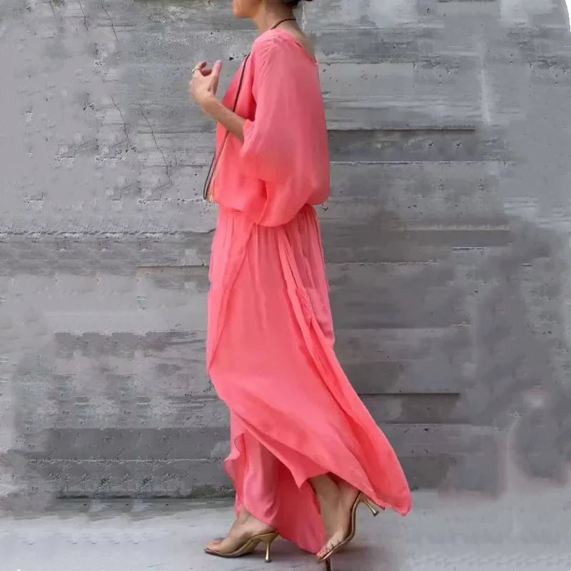 Pilar™ es la definición de movimiento y sofisticación natural. Este conjunto de dos piezas, blusa fluida y pantalón con capas superpuestas combina elegancia y ligereza con una silueta relajada que estiliza sin esfuerzo. Ideal para cenas, eventos o días en los que buscas destacar con comodidad.