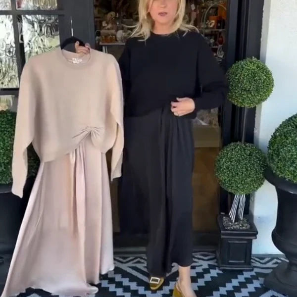 Paula es un conjunto versátil y femenino formado por un jersey suave con nudo delantero y un vestido largo fluido que crea un look equilibrado entre comodidad y elegancia. Su diseño de dos piezas te permite jugar con diferentes combinaciones, adaptándose sin esfuerzo a días informales, planes especiales o cualquier ocasión en la que quieras sentirte cómoda y arreglada.